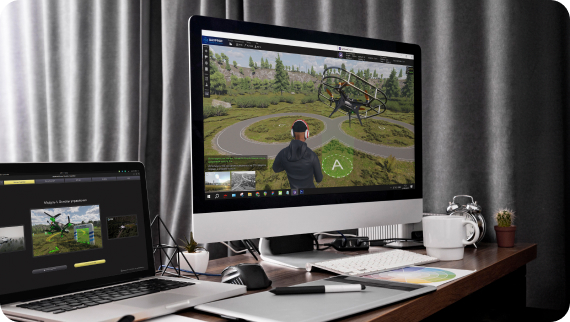 Для полноценного обучения пилотирования FPV-дрона в обучающих и соревновательных миссиях проработаны реалистичная симуляция атмосферы и различные типы местности.